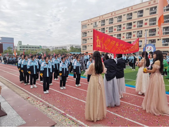 上午八點,伴隨著雄壯的音樂,在主持人的指引下,國旗班的同學(xué)們護衛(wèi)著莊嚴(yán)的國旗,走在入場方陣的最前列。他們踏著堅定的步伐,面帶笑容,精神抖擻,盡情展現(xiàn)著新時代青少年學(xué)子堅韌頑強的精神和熱情澎湃的活力。