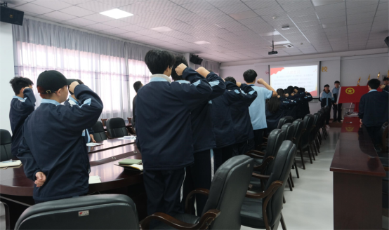 會議最后,全體團員高舉右手,緊握右拳,在團旗下重溫入團誓詞。