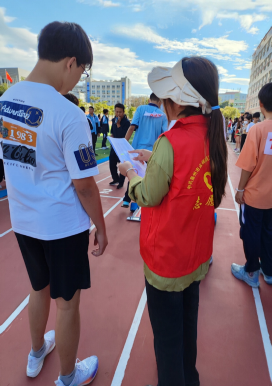 在運(yùn)動(dòng)場(chǎng)的每一個(gè)角落都能見到志愿者的身影,處處活躍著最美“志愿紅”。志愿者們始終堅(jiān)守崗位,為賽道上的運(yùn)動(dòng)員們吶喊助威,拍照記錄精彩瞬間;為運(yùn)動(dòng)員遞送紙巾、飲用水等物資,攙扶下賽場(chǎng)的運(yùn)動(dòng)員等等,提供各種必要的幫助和支持。他們踐行著“奉獻(xiàn)、友愛、互助、進(jìn)步”的志愿者精神,用真心、真情服務(wù)全場(chǎng),用行動(dòng)踐行著黨員團(tuán)員的責(zé)任和擔(dān)當(dāng),他們的辛勤工作得到了全體師生的高度好評(píng)。