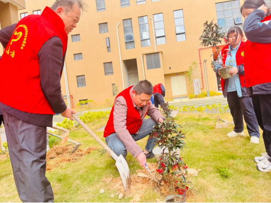 “植”此青綠,共“樹(shù)”未來(lái)。身著紅色志愿馬甲的黨員教師們發(fā)揮先鋒模范作用,帶領(lǐng)學(xué)生們或揮鏟挖穴,或扶苗培土,或提水澆灌,各個(gè)環(huán)節(jié)銜接有序。經(jīng)過(guò)一番辛苦勞作后,桂花樹(shù)、燈籠樹(shù)、三角梅、凌霄花等迎風(fēng)挺立,錯(cuò)落有致,成為今春校園里的第一抹新綠??粗约河H手栽下的小樹(shù)苗,師生們的眼中閃爍著喜悅的光芒。