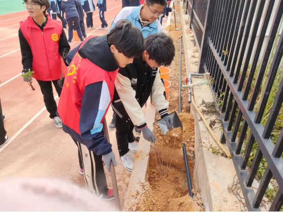 青年志愿,為綠充“植”。師生齊聚,相互協(xié)作,個(gè)個(gè)干勁十足,解袋、扶苗、填土、施肥、澆水,將一棵棵充滿(mǎn)生機(jī)和希望的小樹(shù)植入大地,校園呈現(xiàn)出一派熱火朝天的勞動(dòng)景象。