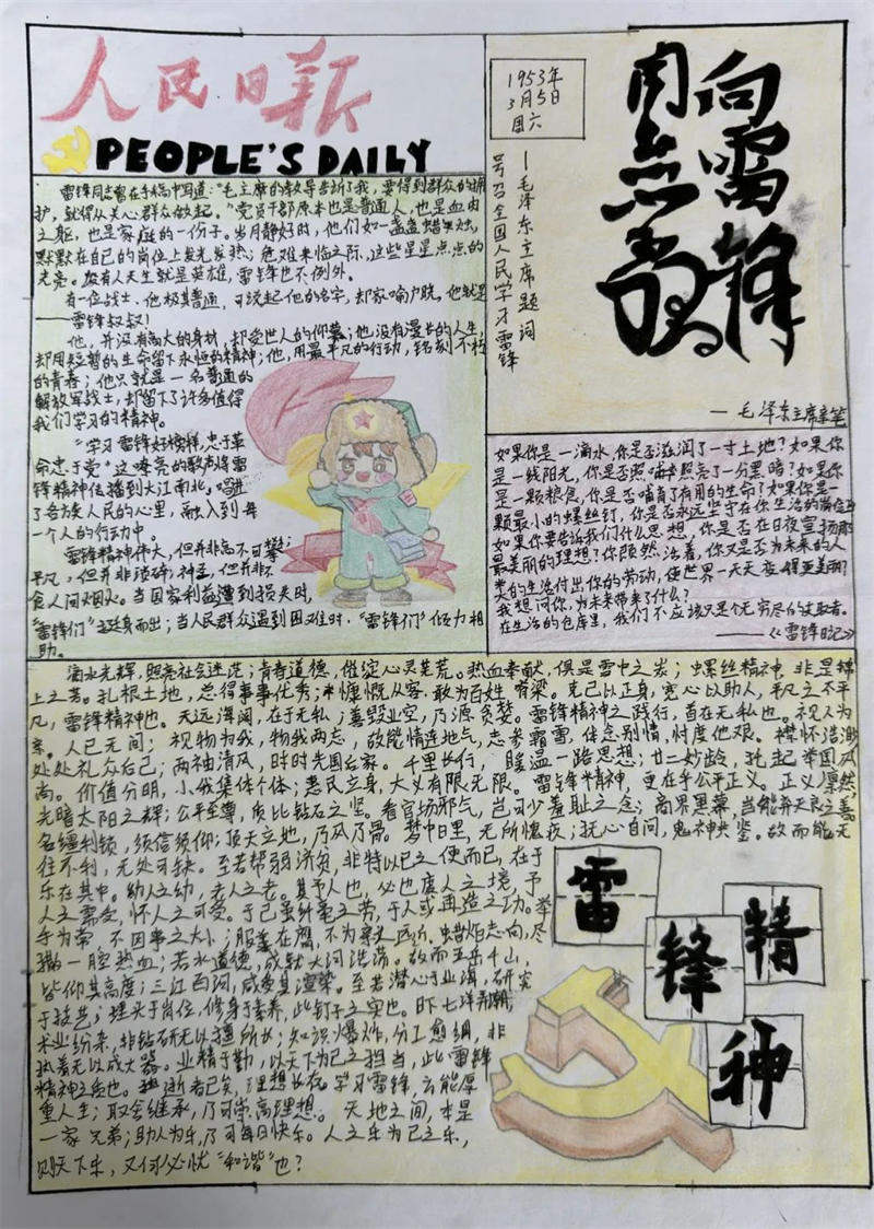 為進一步弘揚中華傳統(tǒng)美德和“奉獻、友愛、互助、進步”的雷鋒精神,倡導(dǎo)社會主義核心價值觀,培養(yǎng)學(xué)生樂于助人、無私奉獻的品質(zhì)。近日,我校團支部在全校范圍內(nèi)開展“弘揚雷鋒精神·爭做時代新人”主題手抄報評比活動,營造學(xué)雷鋒良好氛圍,取得了較好效果。