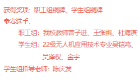 自受領(lǐng)承辦任務(wù)以來(lái),我校高度重視,從賽前調(diào)度、工作籌備到賽場(chǎng)布置、志愿服務(wù)等各項(xiàng)工作,為參賽選手們搭建了切磋技藝、展示技能的平臺(tái),確保了競(jìng)賽的順利進(jìn)行;參賽選手則嚴(yán)格按照大賽規(guī)定和要求積極備賽,強(qiáng)化系統(tǒng)專業(yè)的培訓(xùn),最終在與來(lái)自泉州市各大中專院校、企業(yè)的優(yōu)秀選手同場(chǎng)競(jìng)技中取得佳績(jī)。本次賽事是我校無(wú)人機(jī)技術(shù)應(yīng)用專業(yè)淬煉技能水平、檢驗(yàn)育人成果的一次見證,也是我校辦學(xué)實(shí)力、賽事舉辦能力的一次檢驗(yàn),充分體現(xiàn)我校師生朝氣蓬勃的精神風(fēng)貌。
