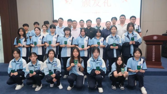 參會的領(lǐng)導(dǎo)、老師為新團員佩戴團徽,頒發(fā)團員證。佩戴上團徽的這一刻,他們成為了共青團的一份子,也肩負起了時代的重任。