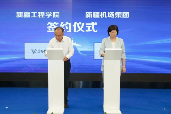 新疆工程學(xué)院與新疆機(jī)場(集團(tuán))有限責(zé)任公司簽約,新疆天云教育集團(tuán)各籌建單位共同簽約。