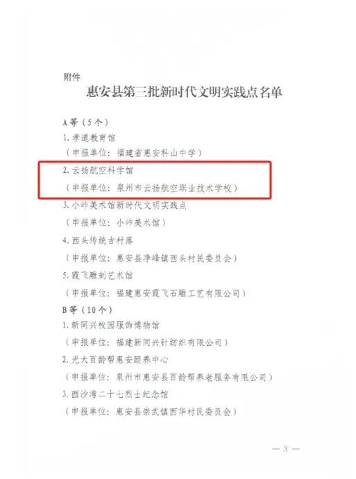 近日,中共惠安縣委宣傳部、中共惠安縣委文明辦聯(lián)合相關部門圍繞陣地打造、制度建設、隊伍培育、活動開展成果成效等項目對申報單位開展資格審核、實地走訪調研、驗收檢查,在全縣遴選出35個新時代文明實踐點,其中A級5個,B級10個,C級20個,我校云揚航空科學館入選惠安縣第三批A級新時代文明實踐點!