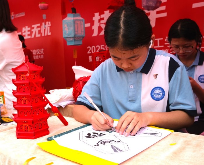 泉州紙雕花燈非遺展區(qū)驚艷全場(chǎng),學(xué)生巧手雕刻各類花燈,燈光亮起時(shí),薄如蟬翼的宣紙化身藝術(shù)珍品,讓這門老手藝煥發(fā)新生機(jī),引來各校師生駐足體驗(yàn)親手制作一盞心儀的花燈。