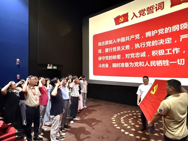 觀影結(jié)束后,在肅穆的氛圍中,黨支部書(shū)記潘向東同志帶領(lǐng)全體黨員,面向鮮紅的黨旗,重溫入黨誓詞。“我志愿加入中國(guó)共產(chǎn)黨……” 鏗鏘有力的誓言在影廳內(nèi)回蕩。黨員們緊握右拳,目光堅(jiān)毅,字字千鈞的承諾,不僅是對(duì)入黨初心的深情回溯,更是對(duì)“為黨育人、為國(guó)育才”神圣使命的鄭重宣示。這一刻,教育工作者肩頭的責(zé)任與擔(dān)當(dāng),在黨性的淬煉中愈發(fā)清晰而堅(jiān)定。
