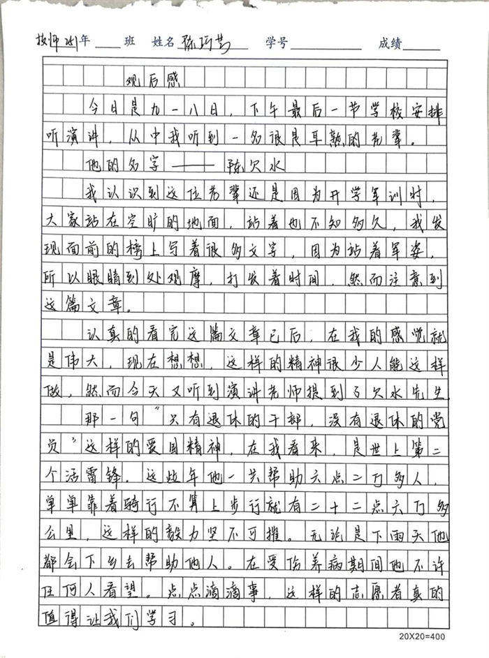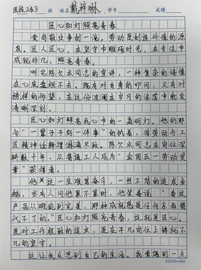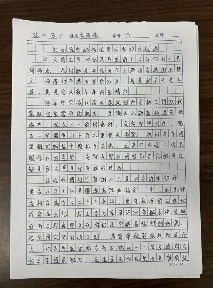 為深化學(xué)習(xí)成效,讓勞模精神真正融入育人全過程,學(xué)校同步啟動“勞模精神照我心”主題征文比賽,鼓勵學(xué)生結(jié)合聆聽感受與自身實(shí)際,暢談對勞動價(jià)值、青春擔(dān)當(dāng)?shù)乃伎?。比賽得到各年級積極響應(yīng),共收到來稿30余篇,同學(xué)們用文字書寫敬意、抒發(fā)志向,紛紛表示要以陳欠水同志為榜樣,刻苦學(xué)習(xí)、服務(wù)社會,讓奮斗成為青春最亮麗的底色。