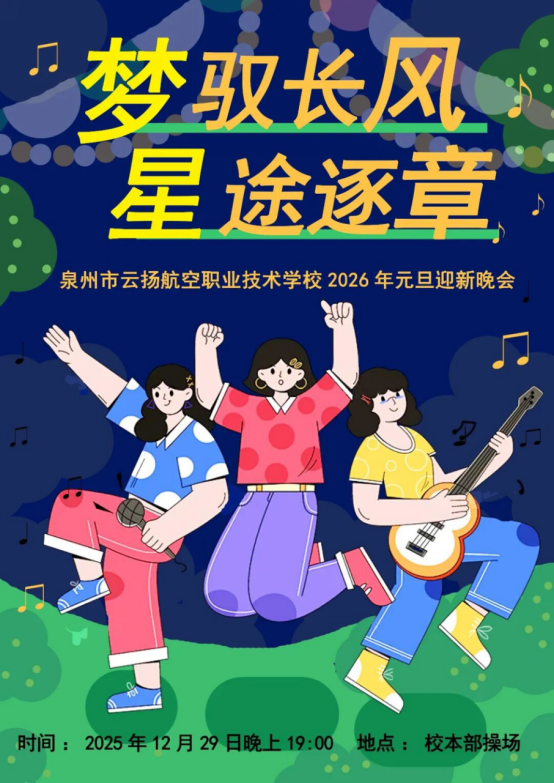 長風(fēng)起于歲末,星河懸于夜空。當(dāng)新年的鐘聲即將叩響時光之門,我們以青春為筆,以熱望為墨,正式發(fā)布今年元旦迎新晚會的璀璨主題——“夢馭長風(fēng),星途逐章”!我們誠摯邀請您,共赴云揚航空學(xué)校2026年元旦迎新晚會。