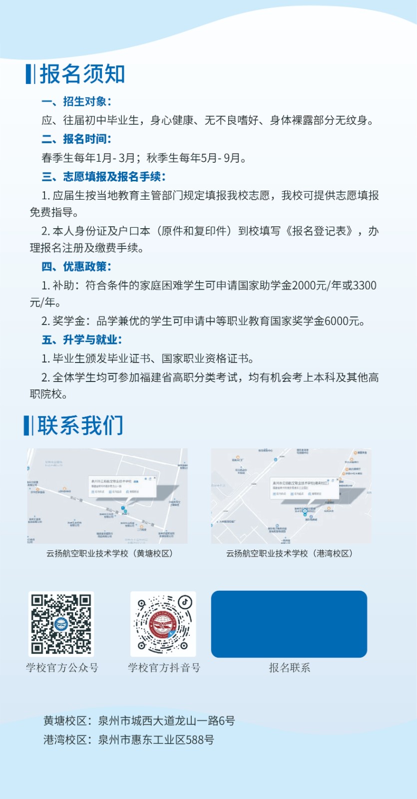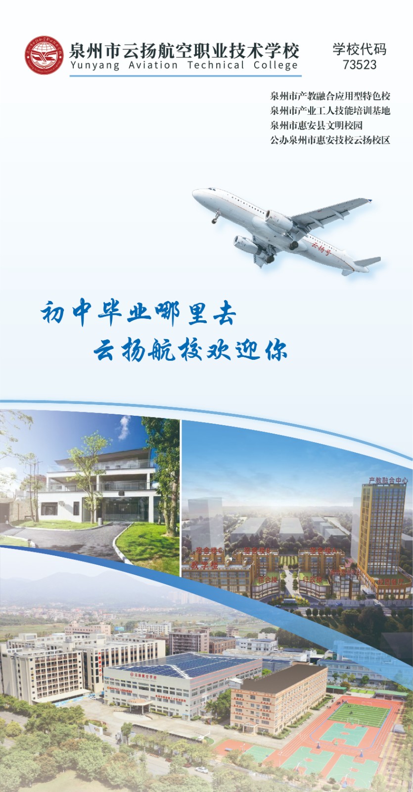 泉州市云揚(yáng)航空職業(yè)技術(shù)學(xué)校(學(xué)校代碼:73523)是人力資源和社會(huì)保障部門批準(zhǔn)區(qū)域重點(diǎn)校,是一所集學(xué)歷教育、職業(yè)培訓(xùn)和航空研學(xué)為一體全日制中等職業(yè)技工學(xué)校。