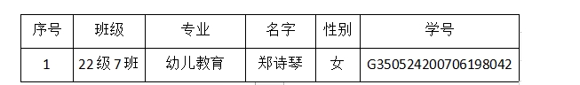 為激勵在校學(xué)生勤奮學(xué)習(xí),努力進(jìn)取,在德、智、體、美等方面全面發(fā)展,根據(jù)《關(guān)于做好2023年技工院校中等職業(yè)教育國家獎學(xué)金評審相關(guān)工作的通知》閩技助文(2023)3號等相關(guān)文件規(guī)定,遵循公開、公正、公平的原則,經(jīng)學(xué)生本人申請,班主任推薦,教務(wù)處和學(xué)工處綜合考察,最終由校長辦公室評審,評選出2022-2023年度國家獎學(xué)金獲獎學(xué)生1名,現(xiàn)予以公示。