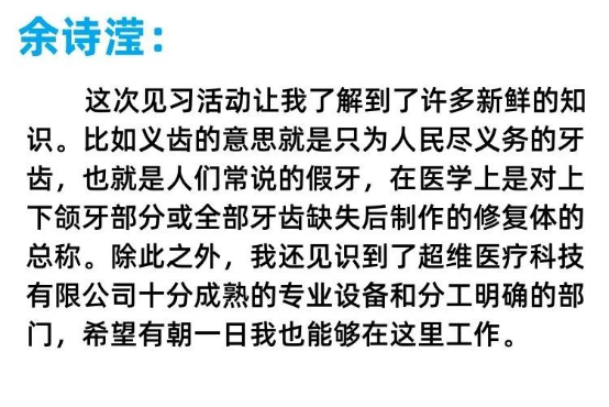 同學(xué)們?cè)邳S高明董事長(zhǎng)及其他工作人員的講解下,了解了超維醫(yī)療科技有限公司的基本情況和該企業(yè)的發(fā)展歷程、企業(yè)文化、管理經(jīng)營(yíng)模式和理念,對(duì)口腔義齒制造專業(yè)的就業(yè)前景有了更深入、細(xì)致的認(rèn)識(shí)。