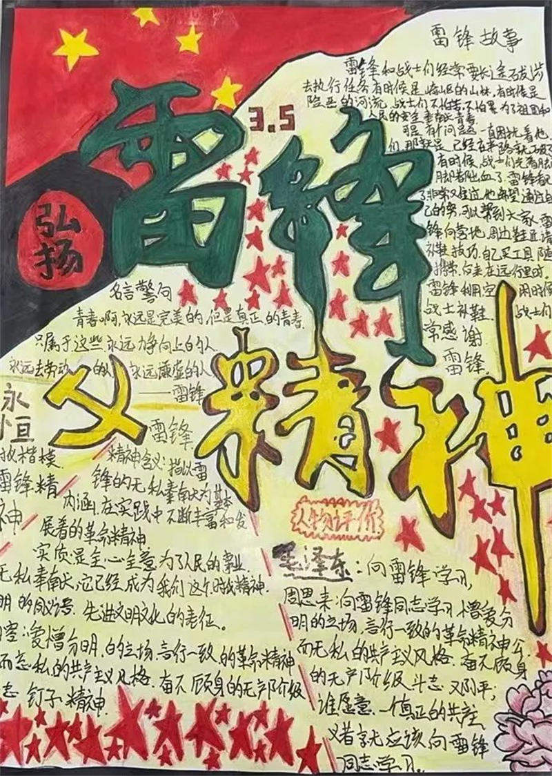 為進(jìn)一步弘揚(yáng)中華傳統(tǒng)美德和“奉獻(xiàn)、友愛(ài)、互助、進(jìn)步”的雷鋒精神,倡導(dǎo)社會(huì)主義核心價(jià)值觀,培養(yǎng)學(xué)生樂(lè)于助人、無(wú)私奉獻(xiàn)的品質(zhì)。近日,我校團(tuán)支部在全校范圍內(nèi)開(kāi)展“弘揚(yáng)雷鋒精神·爭(zhēng)做時(shí)代新人”主題手抄報(bào)評(píng)比活動(dòng),營(yíng)造學(xué)雷鋒良好氛圍,取得了較好效果。