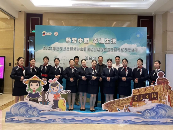 5月17日下午,縣委宣傳部、文明辦,縣文旅局、衛(wèi)健局、工信商務局、市場監(jiān)管局聯(lián)合主辦,縣旅游協(xié)會、惠安文明志愿服務隊承辦,惠安縣戲劇中心、惠安縣薯花志愿者協(xié)會、泉州市云揚航空職業(yè)技術(shù)學校、泉州市紅領(lǐng)巾通訊社惠安分社協(xié)辦的惠安縣“暢游中國 幸福生活”文明旅游主題活動啟動儀式暨文明禮儀專題培訓活動,在達利世紀酒店圓滿舉辦。我校選派航空禮儀隊承擔了航空禮儀展示的節(jié)目表演,為學校獲得贊譽,充分展現(xiàn)我校學生的專業(yè)素養(yǎng)和朝氣蓬勃的精神面貌。