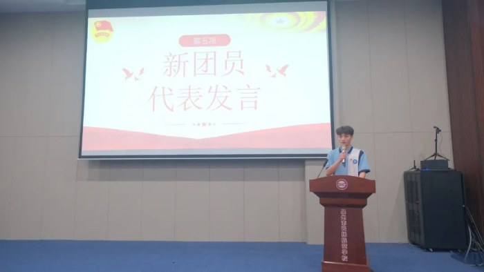 薛育杰同學(xué)作為新團(tuán)員代表發(fā)言,他表示要忠于誓詞,堅(jiān)定理想信念,刻苦學(xué)習(xí)、創(chuàng)新實(shí)踐,不斷提高自身素質(zhì),并呼吁全體團(tuán)員們、同學(xué)們攜起手來(lái),以嶄新的姿態(tài)面對(duì)未來(lái)的挑戰(zhàn)。