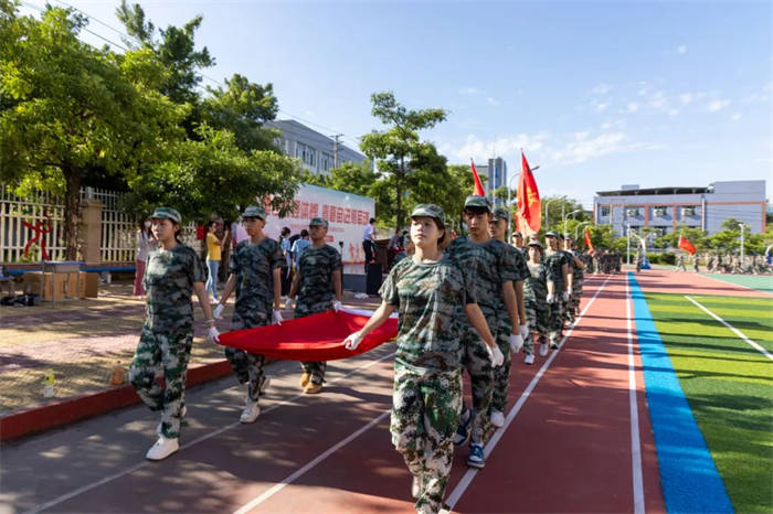 當(dāng)分列式展示的口令下達(dá),操場(chǎng)上各班方隊(duì)依次有序進(jìn)發(fā),以整齊劃一的步伐邁向主席臺(tái)前,具有班級(jí)特色的洪亮口號(hào)響徹云霄,每一名同學(xué)的臉上都洋溢著快樂(lè)、自信與堅(jiān)毅。鏗鏘有力的聲音不僅是良好體能的體現(xiàn),更是他們經(jīng)過(guò)嚴(yán)苛訓(xùn)練后所展現(xiàn)出的紀(jì)律性和團(tuán)隊(duì)協(xié)作精神的絕佳證明。分列式展示不僅是對(duì)軍訓(xùn)成果的檢驗(yàn),更體現(xiàn)出五育并舉、培養(yǎng)新時(shí)代全面發(fā)展優(yōu)秀人才的教育理念。