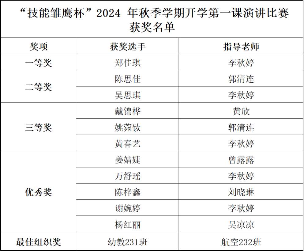 選手們的精彩表現(xiàn)贏得了現(xiàn)場觀眾的陣陣喝彩。評委團根據(jù)演講內(nèi)容、語言表達、形象風(fēng)度等標準,進行了公正評判。最終,獲獎名單如下: