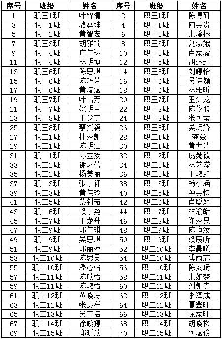 根據(jù)《中國共產(chǎn)主義青年團章程》有關規(guī)定,按照《共青團中央關于印發(fā)<中國共產(chǎn)主義青年團發(fā)展團員工作細則>的通知》(中青發(fā)〔2023〕13號)、《共青團中央印發(fā)<關于新時代新征程加強和改進團員隊伍建設工作的意見>的通知》(中青發(fā)〔2023〕14號)和團縣委《共青團惠安縣委關于高質(zhì)量做好2024年下半年全縣學校領域發(fā)展團員工作的通知》(團惠委〔2024〕21號)文件要求。經(jīng)個人書面申請、班級推薦、積分入團、團校培養(yǎng)、結(jié)業(yè)考核和學校團支部審核等環(huán)節(jié),擬確定以下70名學生為2024年下半年團員發(fā)展對象,現(xiàn)將名單進行公示,公示期為2024年11月11日至11月15日。