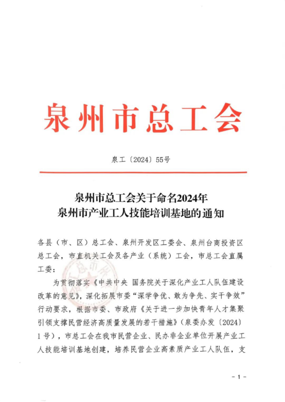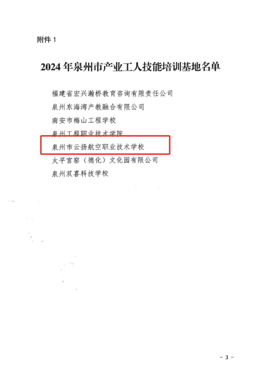 12月8日,泉州市總工會(huì)發(fā)文,泉州市云揚(yáng)航空職業(yè)技術(shù)學(xué)校被泉州市總工會(huì)命名為2024年泉州市產(chǎn)業(yè)工人技能培訓(xùn)基地。