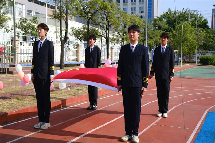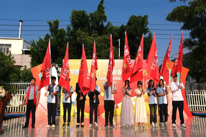 校領(lǐng)導(dǎo)為各班授予學(xué)考沖鋒旗,學(xué)子們莊嚴(yán)宣誓:“沖刺職教高考,不負(fù)青春!”