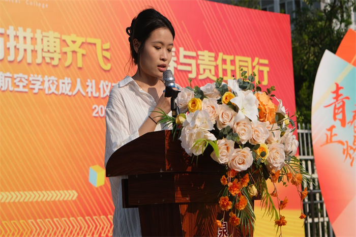 23級(jí)航空231班陳杰的家長(zhǎng)陳國(guó)和先生代表家長(zhǎng)發(fā)言,表達(dá)對(duì)孩子成長(zhǎng)的驕傲,感謝學(xué)校培養(yǎng),并祝愿孩子們?cè)诼毥谈呖贾腥〉眉芽?jī)。