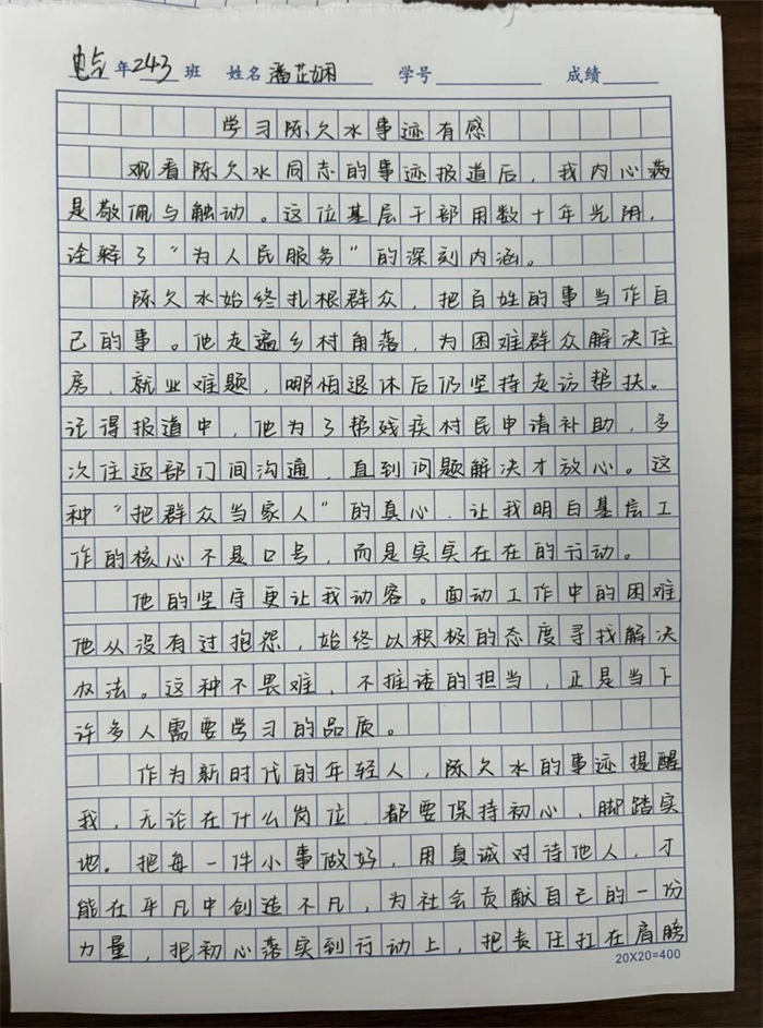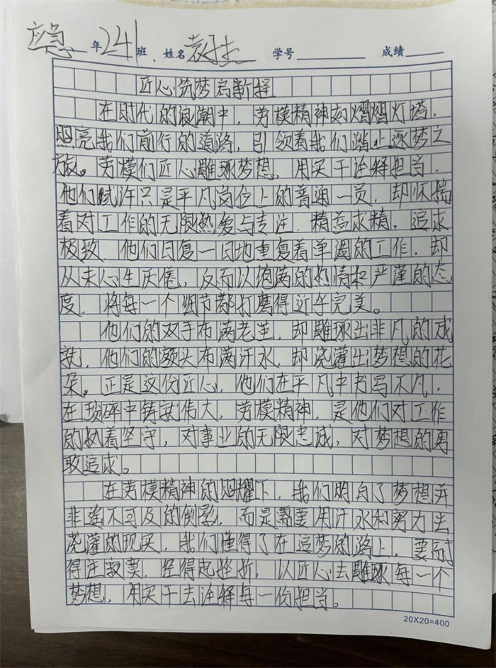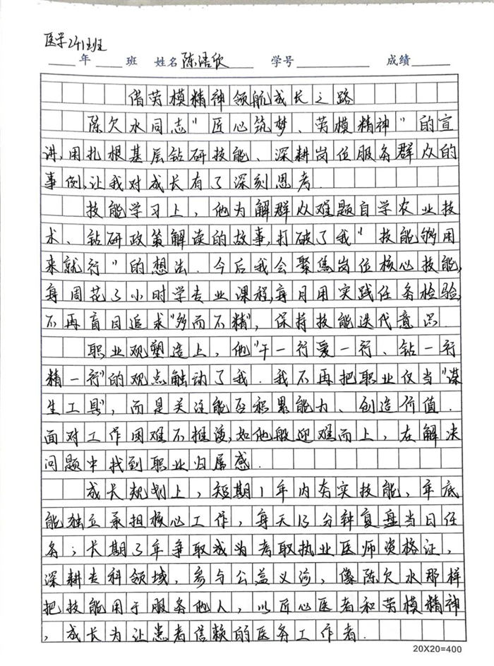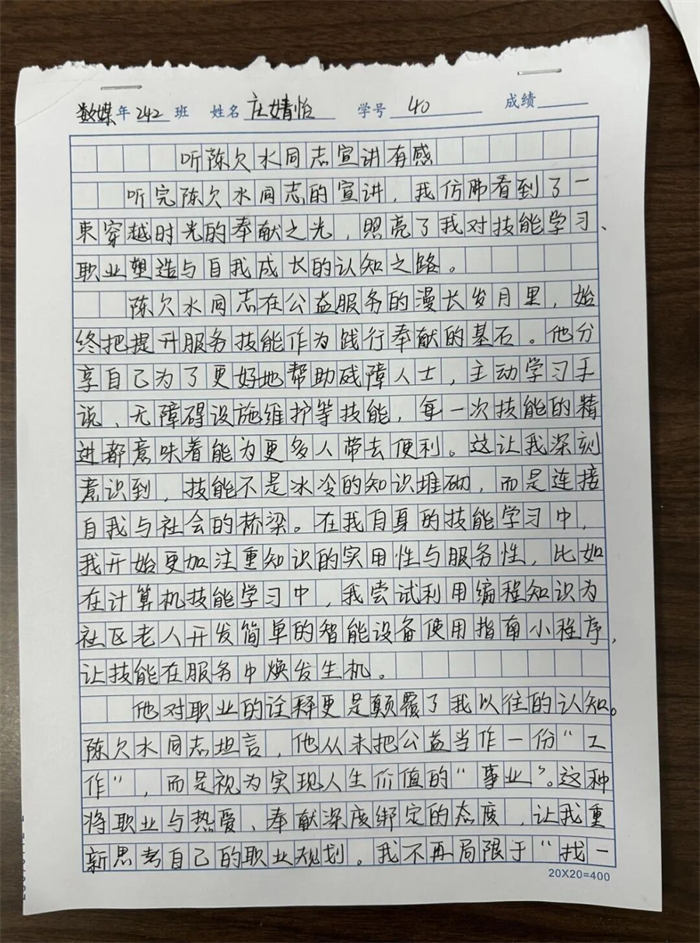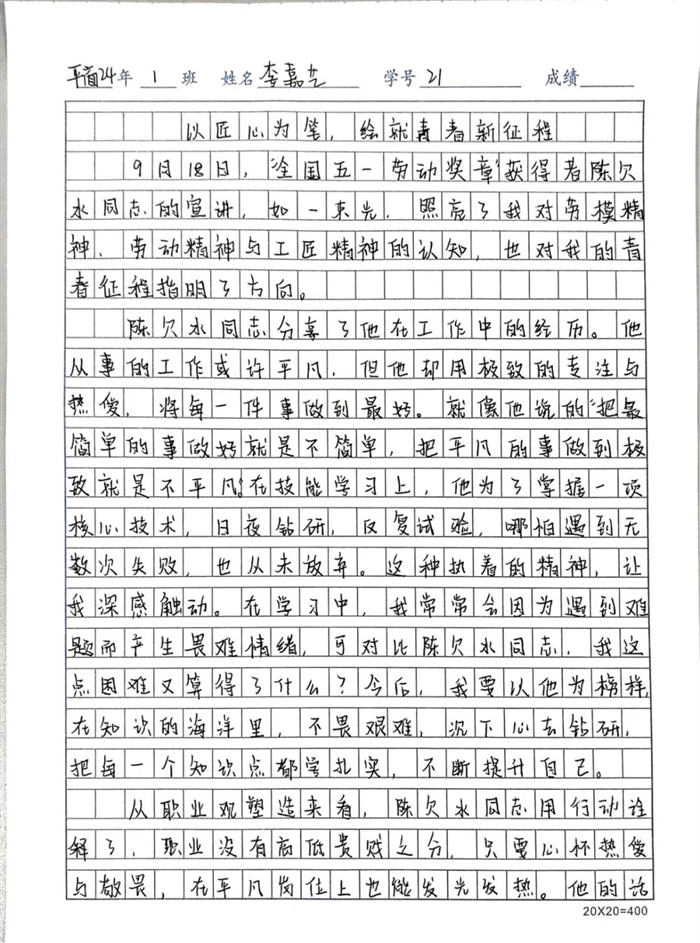 為深化學(xué)習(xí)成效,讓勞模精神真正融入育人全過程,學(xué)校同步啟動“勞模精神照我心”主題征文比賽,鼓勵學(xué)生結(jié)合聆聽感受與自身實際,暢談對勞動價值、青春擔(dān)當(dāng)?shù)乃伎?。比賽得到各年級積極響應(yīng),共收到來稿30余篇,同學(xué)們用文字書寫敬意、抒發(fā)志向,紛紛表示要以陳欠水同志為榜樣,刻苦學(xué)習(xí)、服務(wù)社會,讓奮斗成為青春最亮麗的底色。
