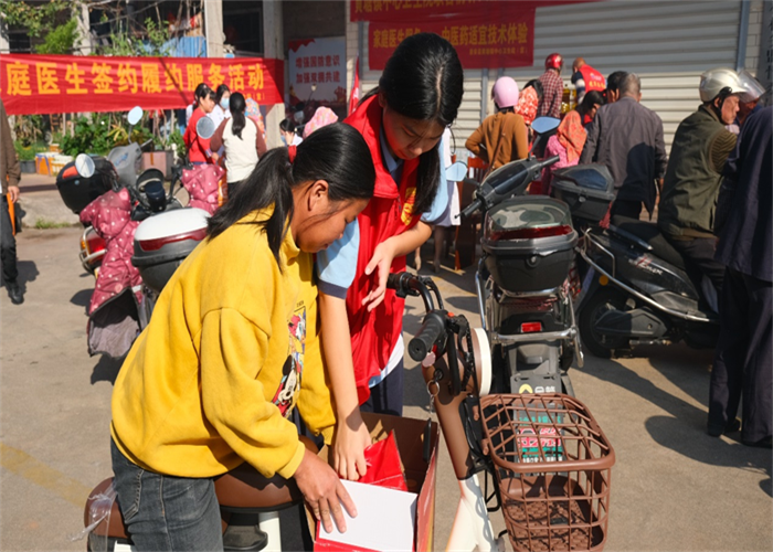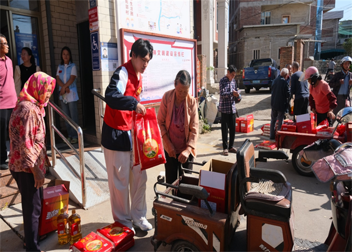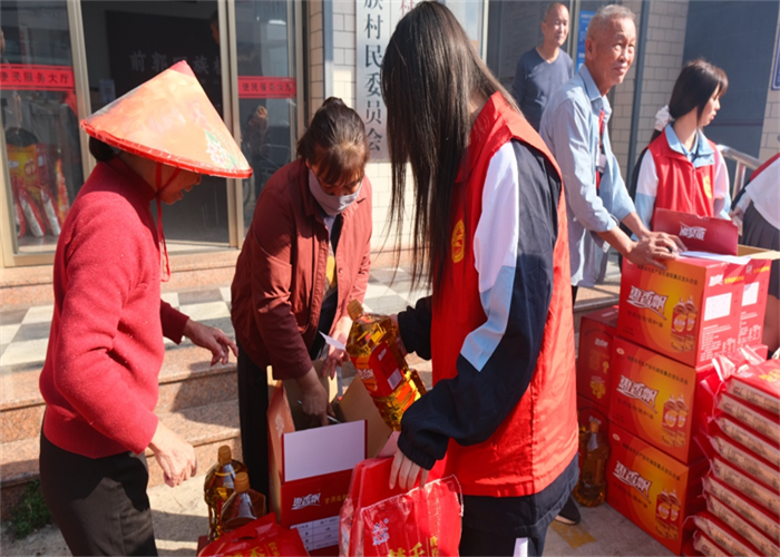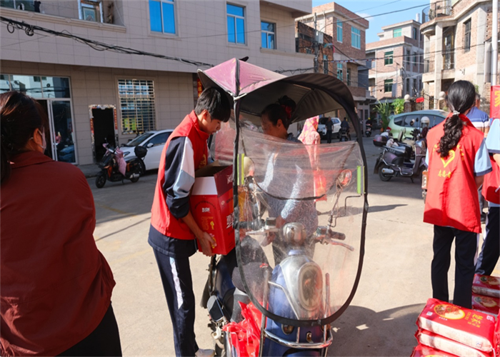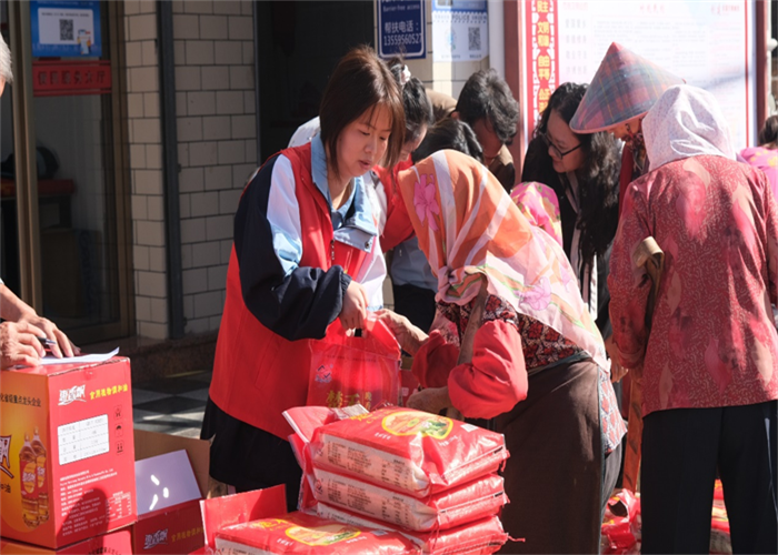 前郭村委會廣場上早已人聲鼎沸,舞蹈與煙花交織出濃濃的節(jié)日氣氛。人群中,我校志愿者們的身影格外醒目。他們俯身與老人交談,細心遞上物品,認真傾聽他們的家常,關切詢問健康狀況與生活起居,將青年一代的敬意與關懷,化作一句句溫暖問候,傳遞到每位老人心中。