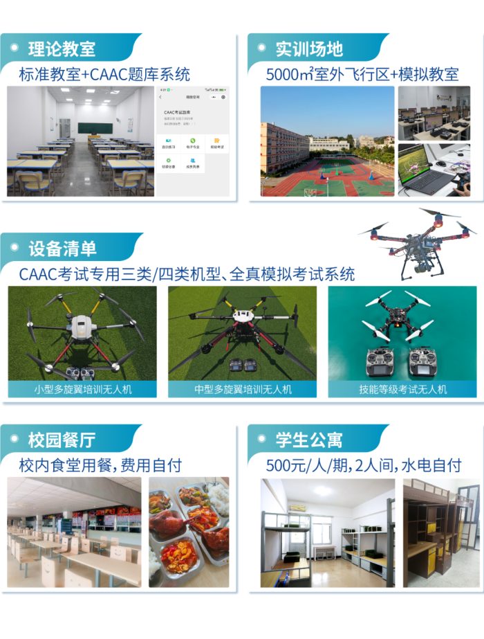 學(xué)校占地123畝,由黃塘和港灣校區(qū)組成。建有室內(nèi)外無人機(jī)標(biāo)準(zhǔn)訓(xùn)練場,并配備專業(yè)的CAAC執(zhí)教團(tuán)隊(duì),可提供“理論教學(xué)-實(shí)操訓(xùn)練-執(zhí)照考核-就業(yè)推薦”一站式服務(wù)。