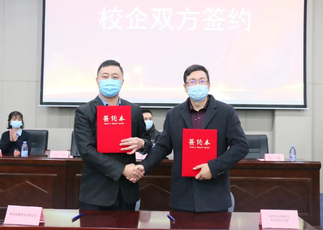 泉州市云揚(yáng)航空職業(yè)技術(shù)學(xué)校與惠安潤泰商務(wù)有限公司代表現(xiàn)場簽訂企業(yè)新型學(xué)徒制校企合作協(xié)議,我校遲巖校長為企業(yè)實訓(xùn)導(dǎo)師頒發(fā)聘書。